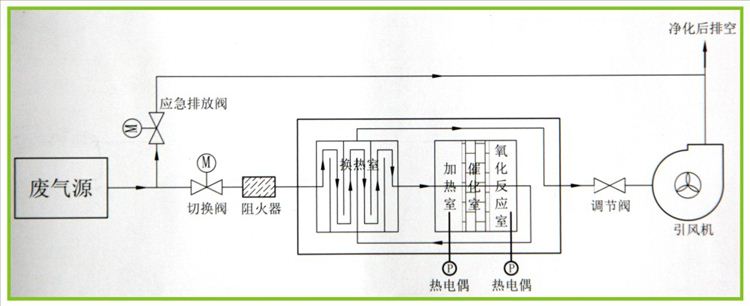 入熱交換器,將廢氣加熱到催化燃燒所需要的起始溫度。經(jīng)過預(yù)熱的廢氣,通過催化劑層使之燃燒。由于催化劑的作用,催化燃燒法廢氣燃燒的起始溫度約為250-300℃,大大低于直接燃燒法的燃燒溫度650-800℃,因此能耗遠(yuǎn)比直接燃燒法為低。同時在催化劑的活性作用下,反應(yīng)后的氣體產(chǎn)生一定的熱量,高溫氣體再次進(jìn)入熱交換器,經(jīng)換熱冷卻,最終以較低的溫度經(jīng)風(fēng)機(jī)排人大氣。